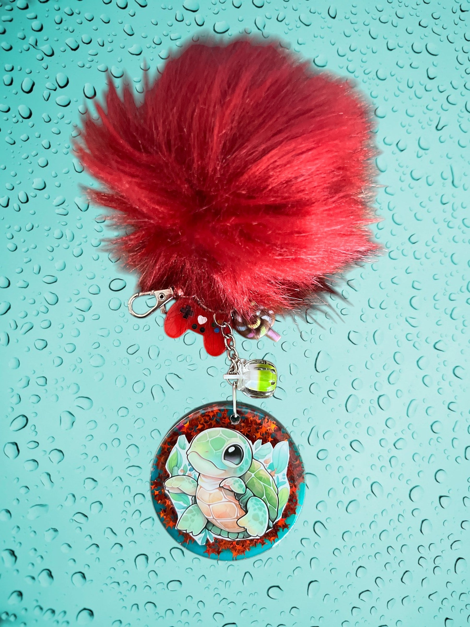 Meet your new bag's best friend! This adorable cartoon sea turtle features a soft, red pom pom that adds playful texture and charm. With whimsical details and a cheerful design, it's the perfect accessory to brighten any backpack, purse, or tote. Whether you're personalizing a gift or treating yourself, this cute turtle charm brings a splash of ocean-inspired joy to your everyday carry.