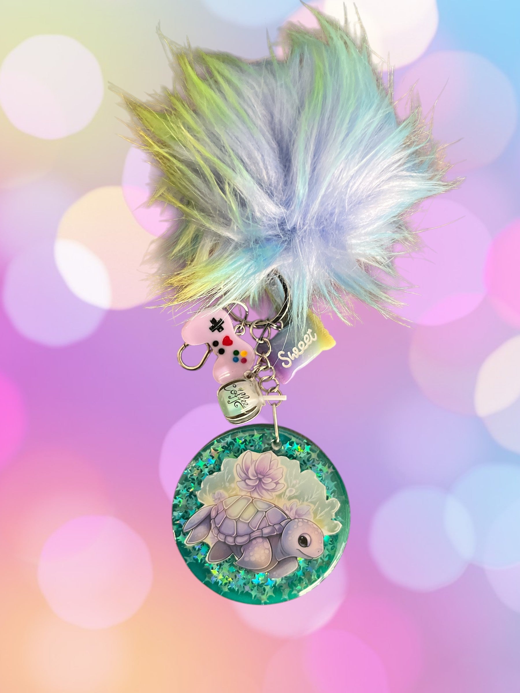 Meet your new bag's best friend! This adorable cartoon sea turtle features a soft, multi colored pastel pom pom that adds playful texture and charm. With whimsical details and a cheerful design, it's the perfect accessory to brighten any backpack, purse, or tote. Whether you're personalizing a gift or treating yourself, this cute turtle charm brings a splash of ocean-inspired joy to your everyday carry.