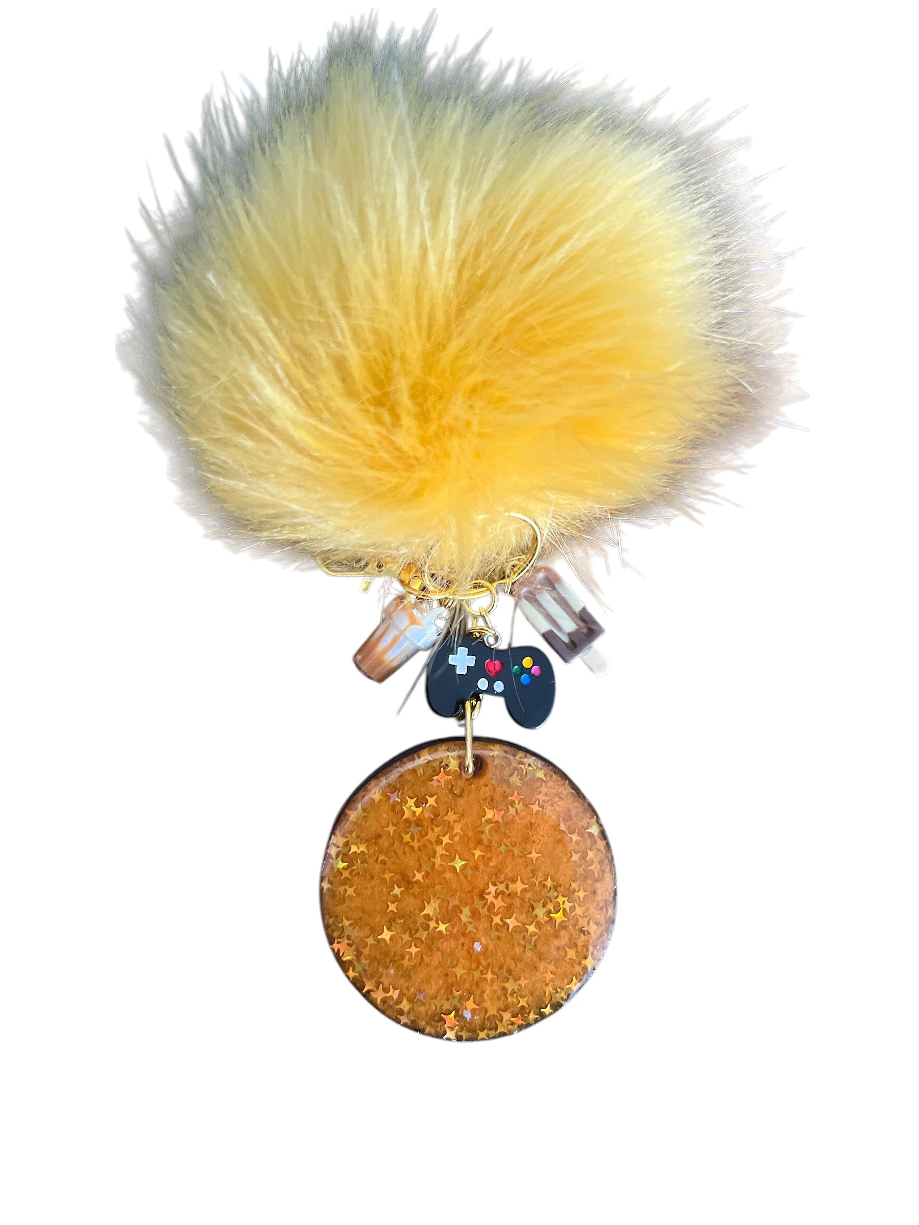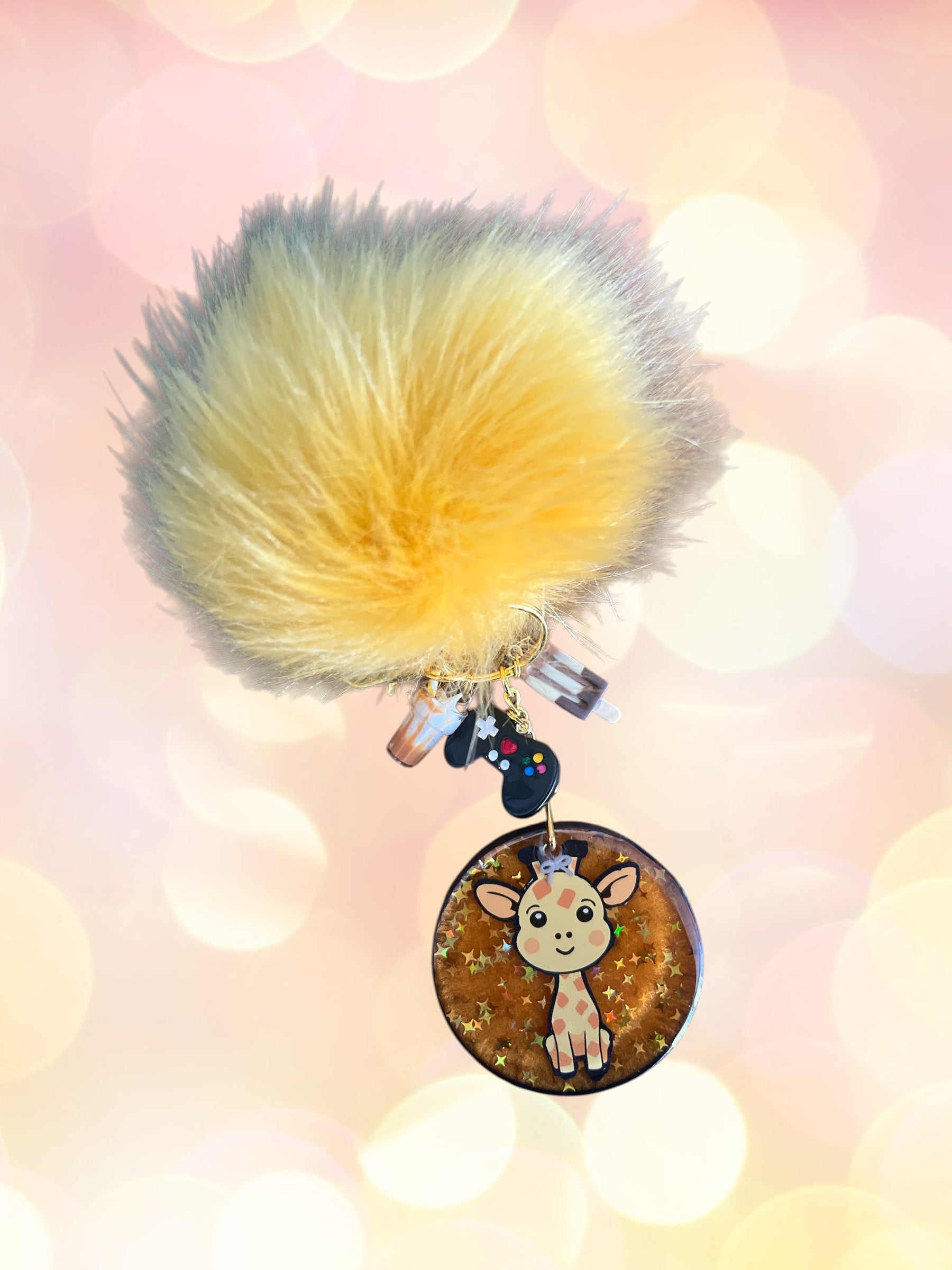 This artisan resin bag charm features an endearing giraffe design complemented by an assortment of coordinating charms and a cheerful yellow pom pom. Meticulously crafted by hand, each charm demonstrates the quality and attention to detail characteristic of custom resin work. An ideal accessory for personalizing bags, backpacks, or keychains with a touch of handmade sophistication and whimsical charm.