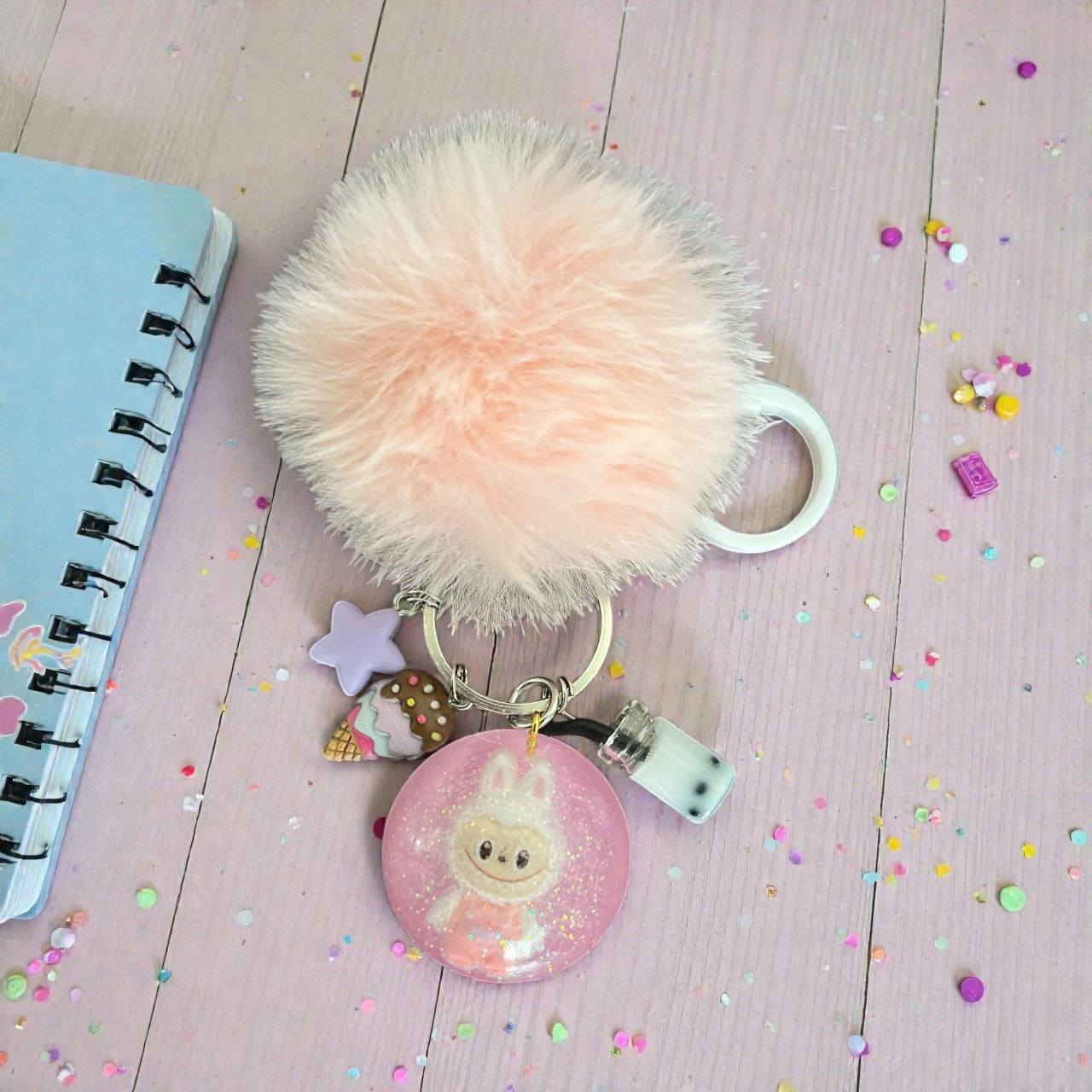 Unleash your inner child with our Inspired by Labubu bag charms. Each one is handmade with colorful resin, whimsical charms, and a matching pom pom. Get ready to add playful personality to your bag!