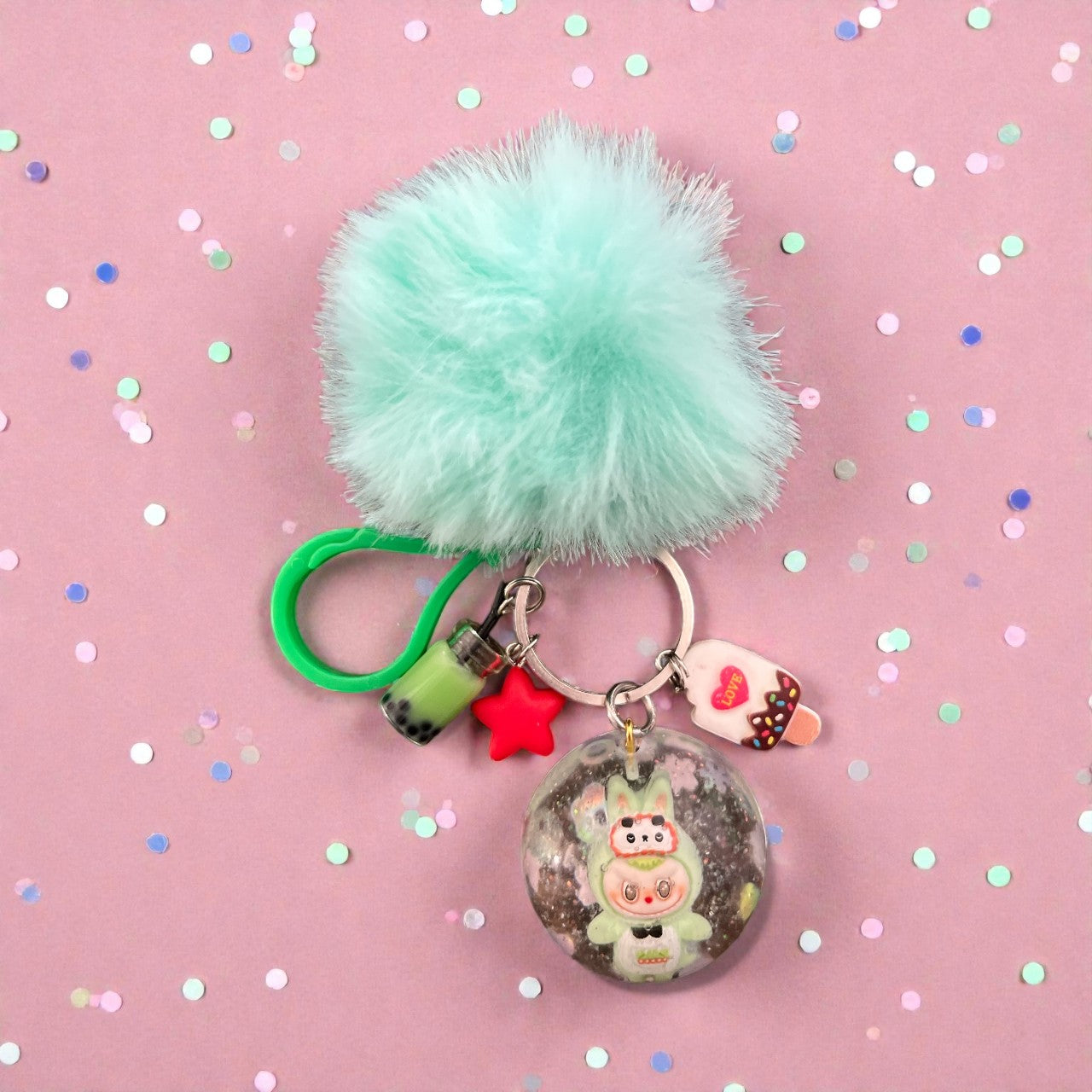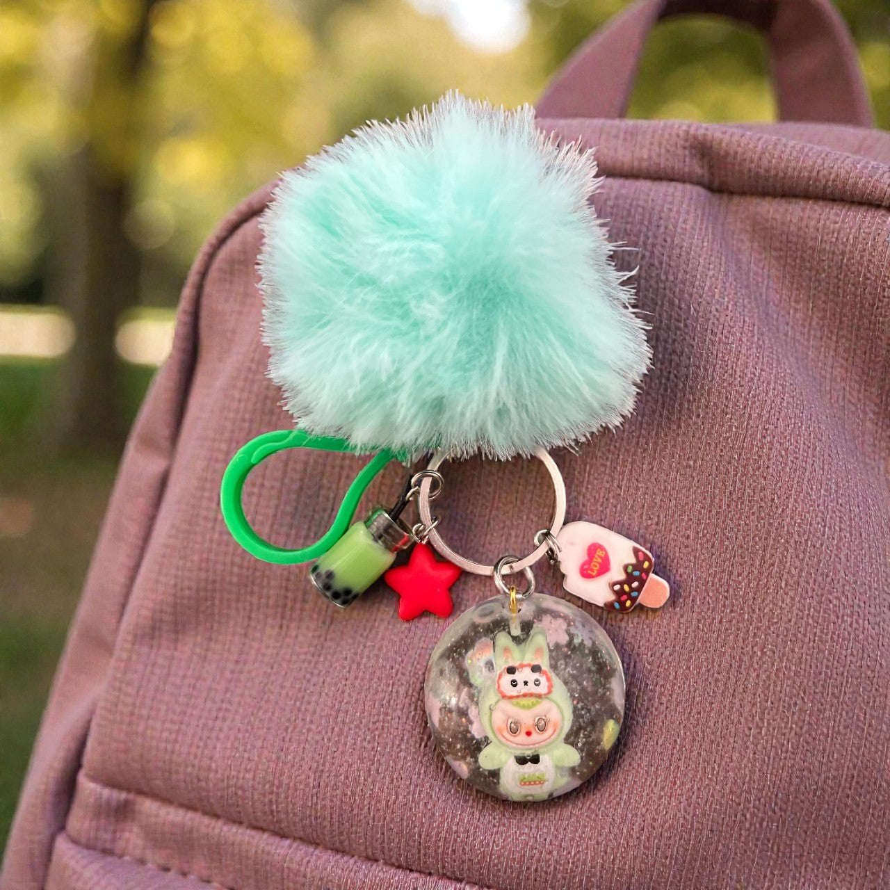 Unleash your inner child with our Inspired by Labubu bag charms. Each one is handmade with colorful resin, whimsical charms, and a matching pom pom. Get ready to add playful personality to your bag!