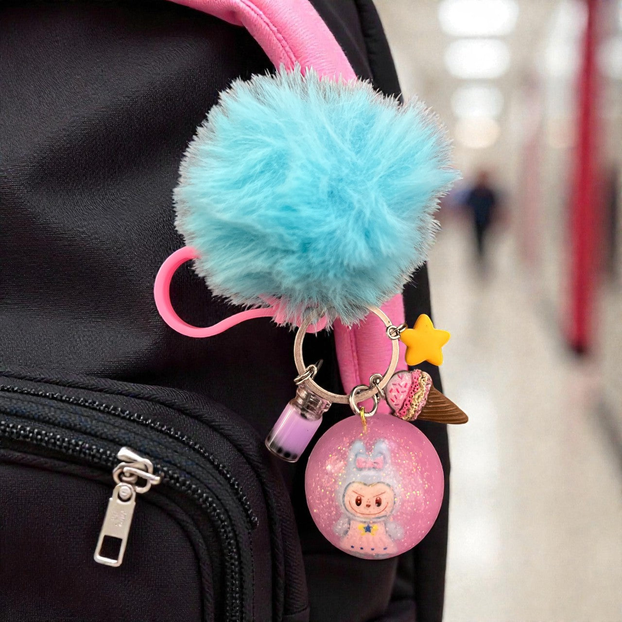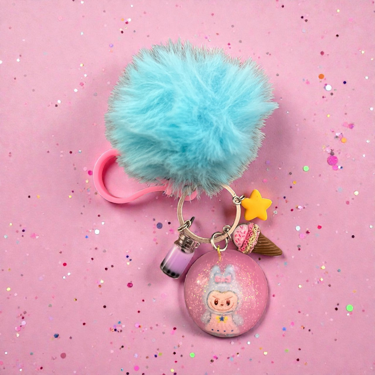 Unleash your inner child with our Inspired by Labubu bag charms. Each one is handmade with colorful resin, whimsical charms, and a matching pom pom. Get ready to add playful personality to your bag!