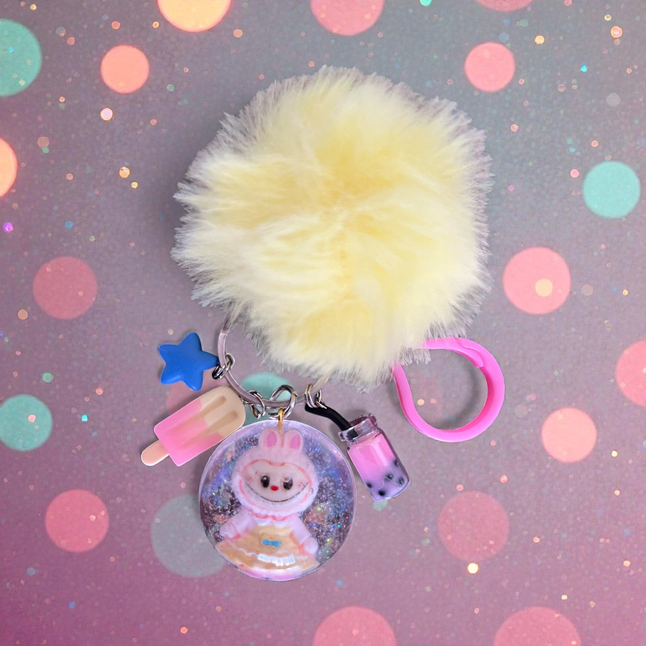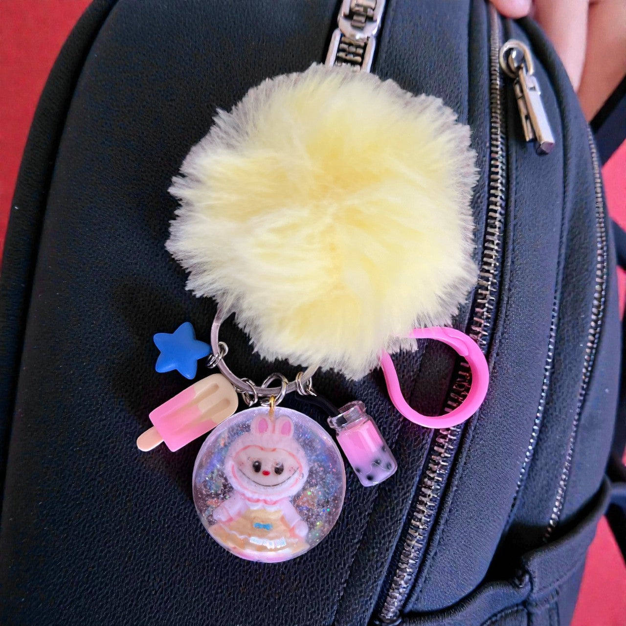 Unleash your inner child with our Inspired by Labubu bag charms. Each one is handmade with colorful resin, whimsical charms, and a matching pom pom. Get ready to add playful personality to your bag!