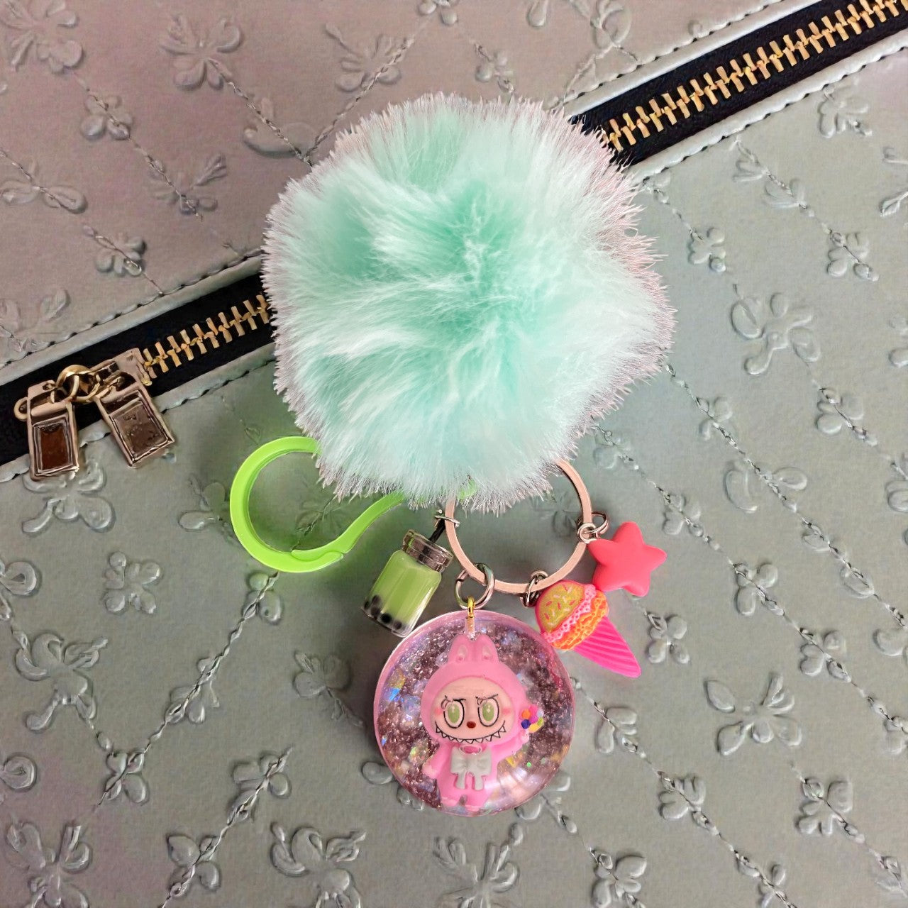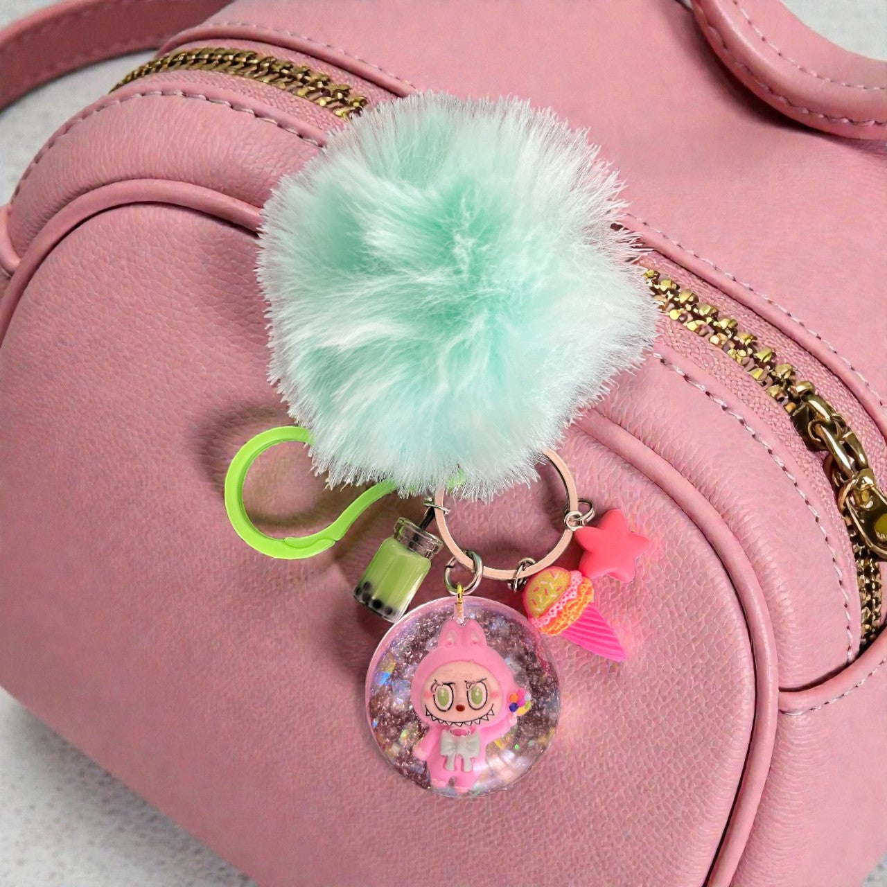 Unleash your inner child with our Inspired by Labubu bag charms. Each one is handmade with colorful resin, whimsical charms, and a matching pom pom. Get ready to add playful personality to your bag!